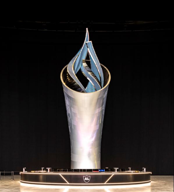 這項高達28.3公尺(93foot)的巨大火炬放置在全新打造並甫於今年完工的美式足球拉斯維加斯突襲者隊體育館(Allegiant Stadium),是由德州的設計建築公司Diemensional Innovations所啟動的專案。這個巨大的設計當然也是採用了3D列印技術,由擅長大物件列印的Thermwood使用獨家的LSAM技術來列印出多達225個3D模組組合而成,每個模組重達約160公斤,使用的是含碳纖維的PC複合材料。