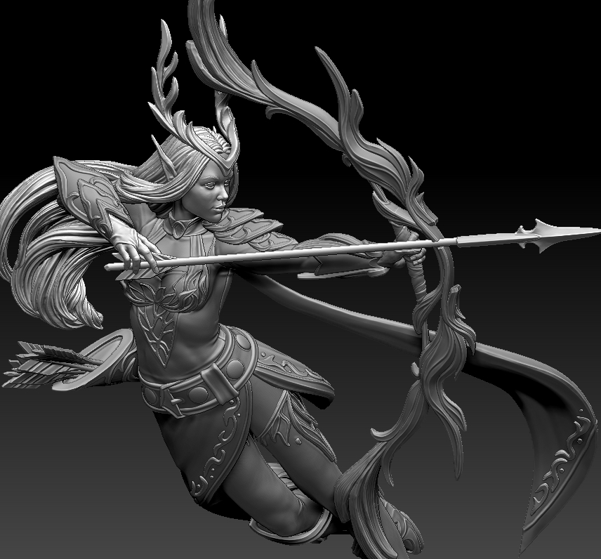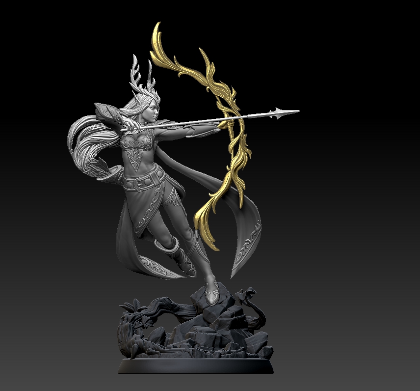 第二個手持長弓的狩獵女神也不惶多讓,手上那把奇幻的金弓已足夠引人注目,優雅的身型與美麗的臉龐更是為這尊模型注入更多的讚美,講究細節雕塑的設計師也為身上不多的衣飾增添許多細緻的雕花與圖案,這些細節在上色後將會更為凸顯,絕對是賞心悅目的作品。